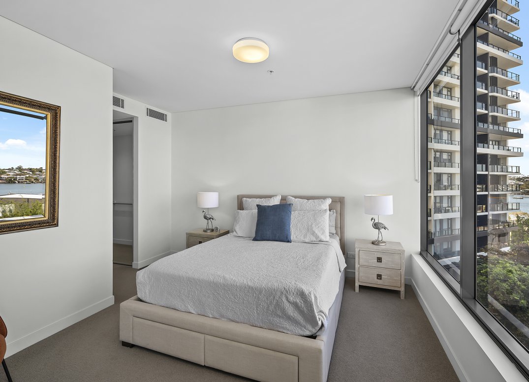 1075 Unison at Waterfront presents a beautifully designed and spacious two-bedroom apartment in one of Newstead’s most desirable lifestyle addresses. Positioned within the acclaimed Unison at Waterfront by Mirvac development, this stylish residence enjoys tranquil glimpses of the Brisbane River and overlooks lush landscaped gardens and sparkling pools – creating a private retreat that feels like a slice of paradise in the heart of Newstead.