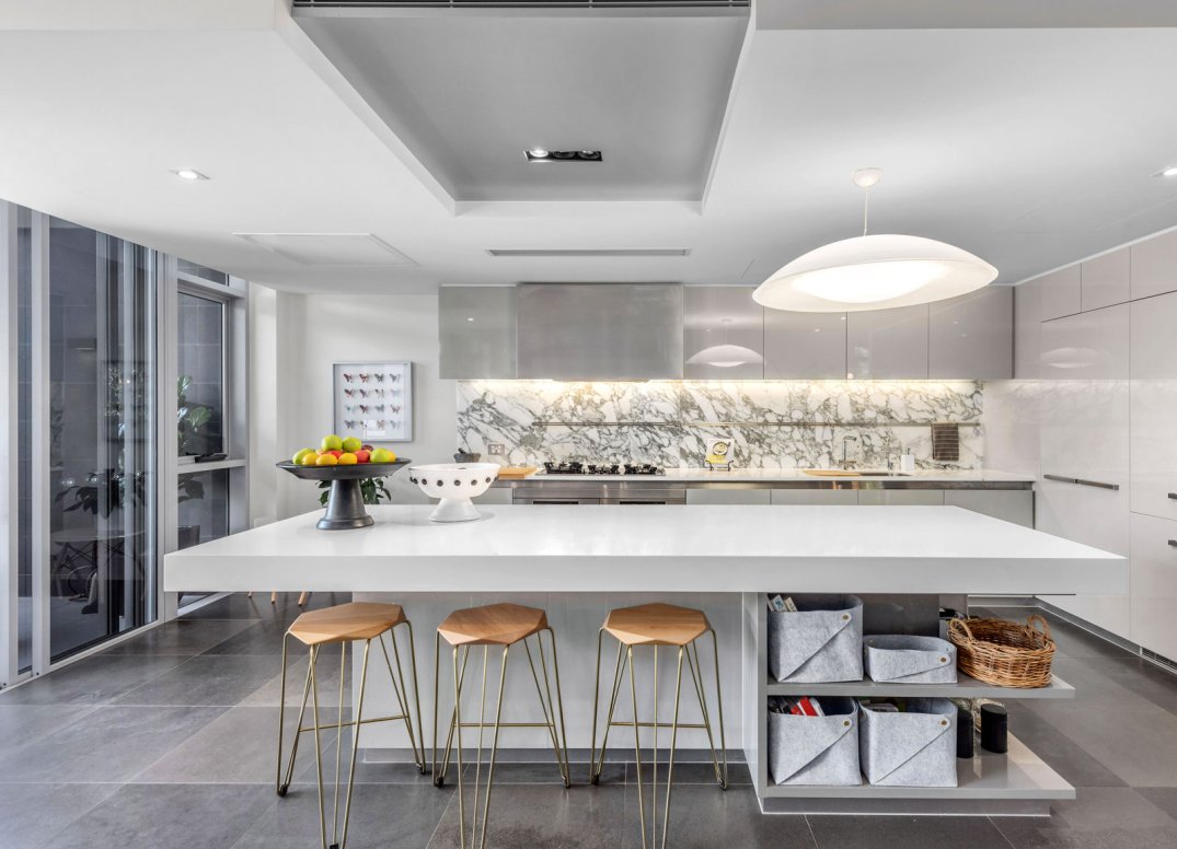 A gourmet cook’s dream, the modern kitchen boasts a range of superb Calacatta marble and stone, fully integrated Miele appliances and a huge island bench which is the entertainment hub of the open plan living and dining areas and the massive riverfront terrace.